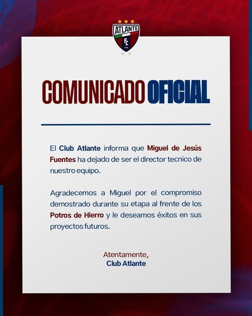 El comunicado oficial del Atlante, difundido en sus redes sociales, confirmó la destitución: “El Club Atlante informa que Miguel de Jesús Fuentes ha dejado de ser el director técnico de nuestro equipo. Agradecemos a Miguel por el compromiso demostrado durante su etapa al frente de los Potros de Hierro y le deseamos éxitos en sus proyectos futuros.”