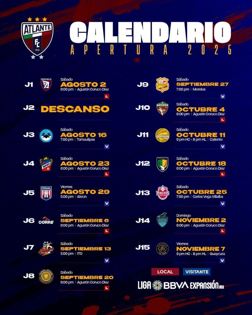 En cuanto a su calendario, después del enfrentamiento ante Tepatitlán, Atlante descansará en la jornada 2 y posteriormente enfrentará a Tamaulipas, Irapuato, Tapatío, Correcaminos, Alebrijes, Leones Negros, Dorados, Mérida, Mineros, Cancún, y cerrará la fase regular ante La Paz.
