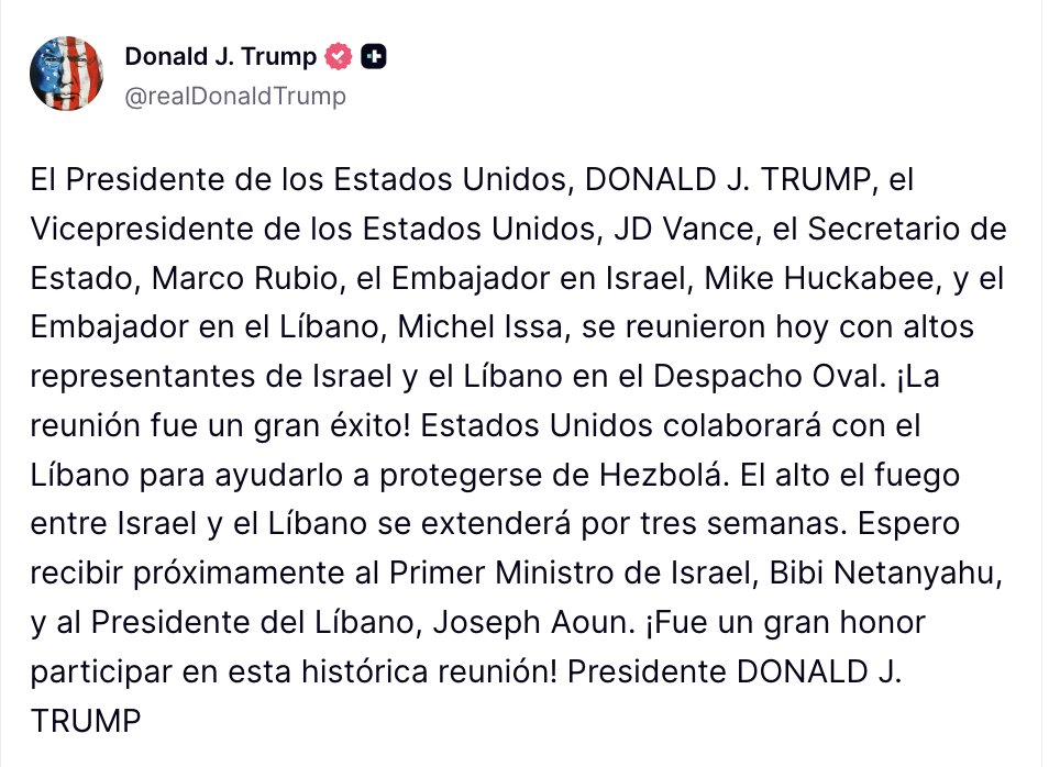 El presidente de Estados Unidos, Donald Trump, informó que el alto el fuego entre Israel y Líbano será extendido por tres semanas más, con el objetivo de mantener abiertas las negociaciones para un acuerdo de paz permanente.