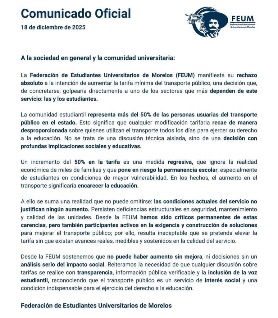 La Federación de Estudiantes de la Universidad Autónoma del Estado de Morelos (FEUM) manifestó su rechazo al posible incremento en la tarifa mínima del transporte público en la entidad, al considerar que esta medida afectaría de manera directa a la comunidad estudiantil. A través de un comunicado, la organización señaló que más del 50 por ciento de las personas usuarias del transporte público en Morelos son estudiantes, quienes dependen diariamente de este servicio para acudir a sus centros educativos.