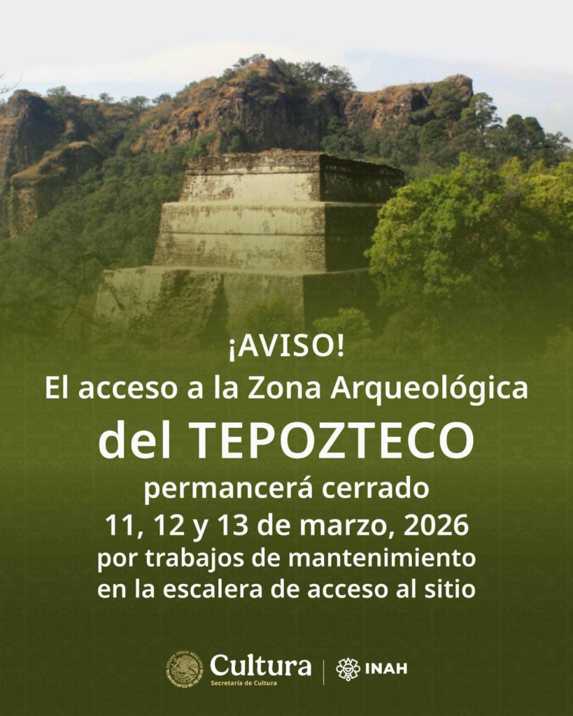 El acceso a la zona arqueológica del Tepozteco, en el municipio de Tepoztlán, permanecerá cerrado los días 11, 12 y 13 de marzo de 2026 debido a trabajos de mantenimiento en la escalera de acceso al sitio.