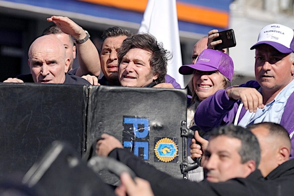 La custodia presidencial intervino rápidamente y sacó al jefe de Estado y a su hermana, Karina Milei, secretaria general de la Presidencia, de la camioneta descubierta en la que viajaban.