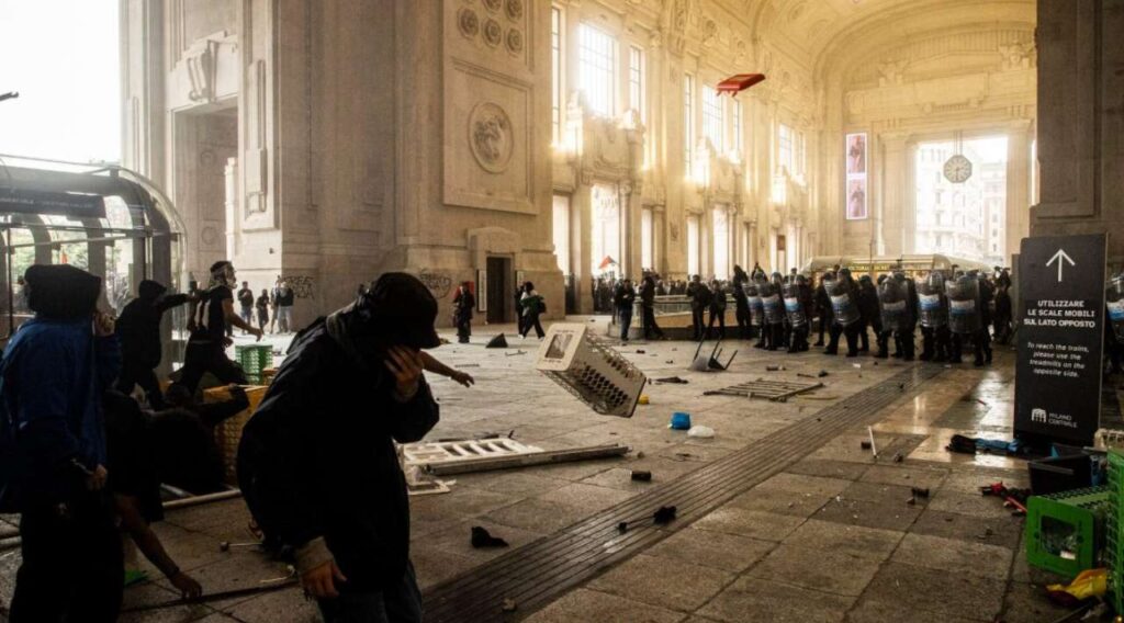 En Milán, la situación escaló cuando manifestantes intentaron irrumpir en la estación central, enfrentándose con la policía antidisturbios, que respondió con gas lacrimógeno. En Bolonia se emplearon cañones de agua para dispersar a los huelguistas.