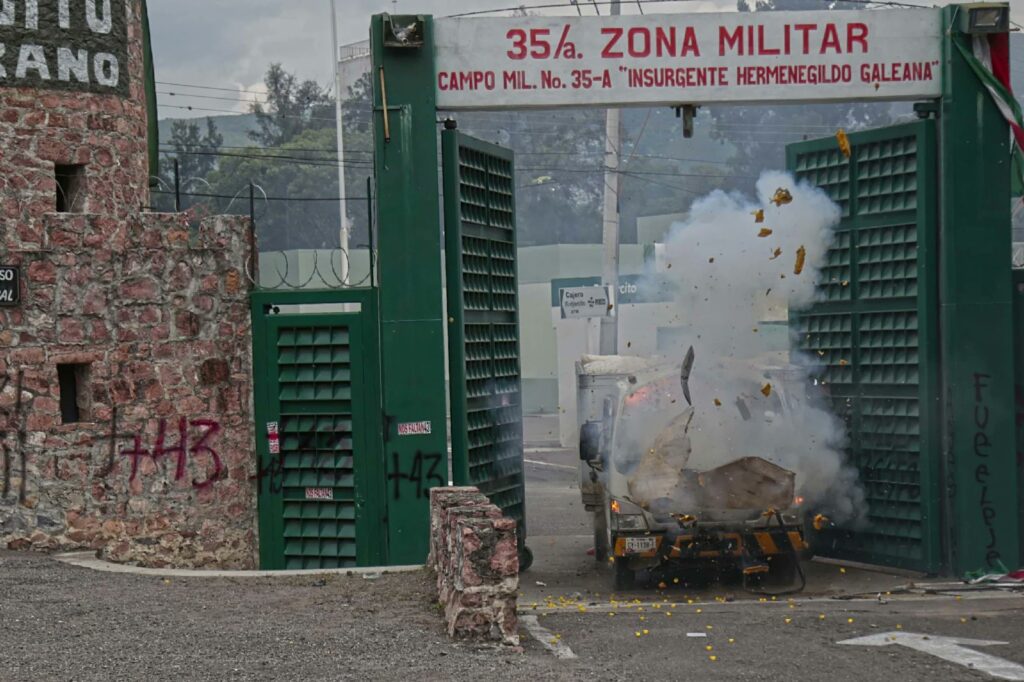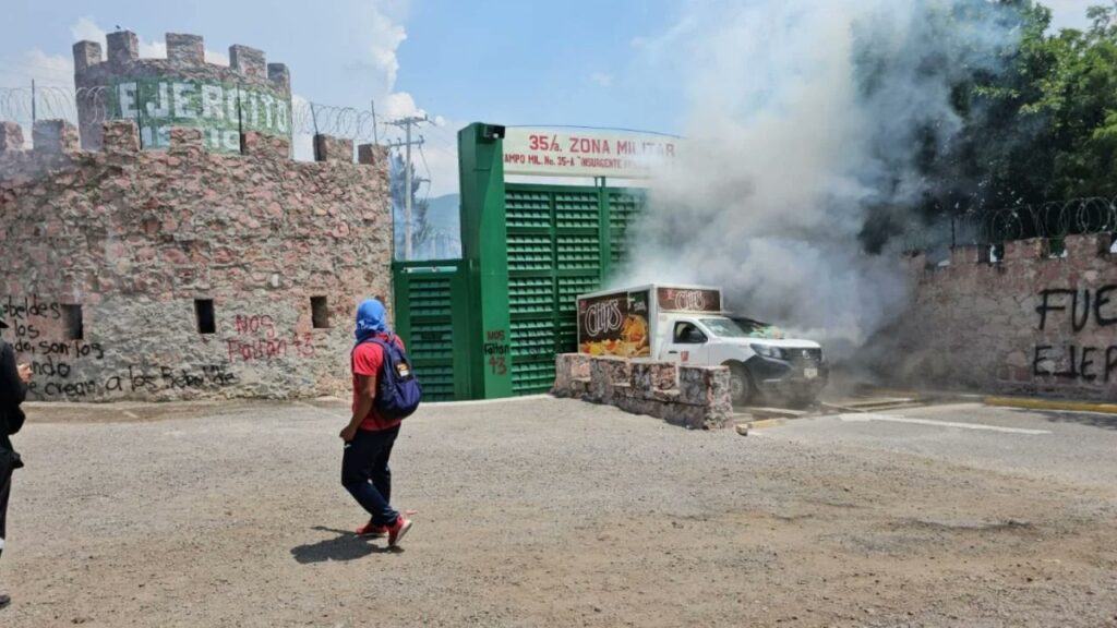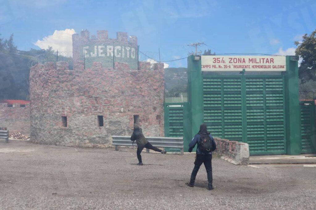 Tras la protesta, los normalistas se dirigieron a las instalaciones militares, donde lanzaron proyectiles improvisados. Personal castrense respondió con gases lacrimógenos para dispersar a los manifestantes.