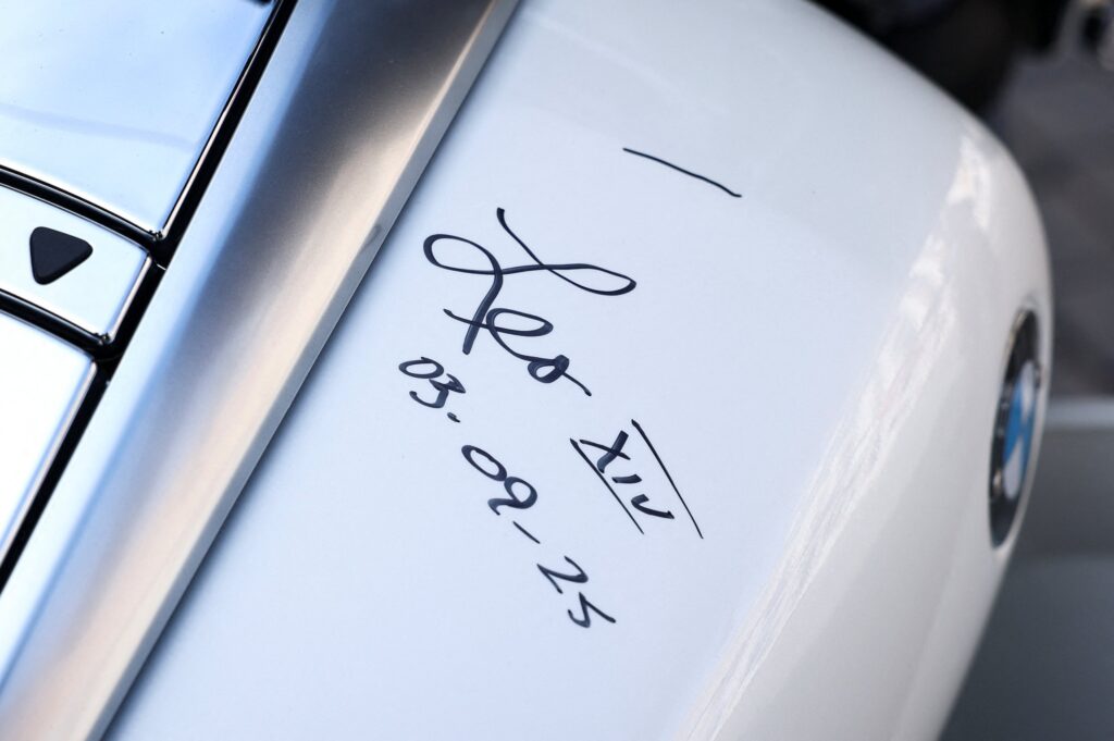 El papa León XIV recibió como obsequio una motocicleta BMW R18 blanca, personalizada con su escudo, su nombre y la palabra “paz” en varios idiomas.