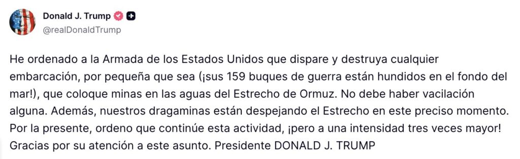 A través de Truth Social, Trump afirmó que las operaciones de desminado en la zona continuarán con mayor intensidad y aseguró que los barcos militares estadounidenses ya trabajan para despejar el paso estratégico.